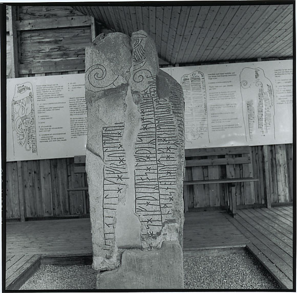 | Alt 4: Sparlösa rune-stone. In the 1800's an old women remembered that when she was young, in the beginning of that century, she did her obligatory work days in the renovation of the church. What she remembered was a peculiar stone that got built into the church wall. Eventually they checked her story out and found this stone, one of the most famous rune-stones in Sweden. It is written in two different rune scripts and it has not been interpreted in its entirety. (Rolleicord V, 1/2 @ f11, Neopan 400 with the Rolleicord sitting on its feet, for lack of a tripod. Scanned from a print). |