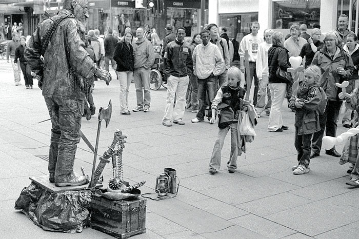 everything was blurred. The girls are very careful as they approach to put a crown or two into his collection tin. Leica M2, 50mm Summicron, 400TMY |