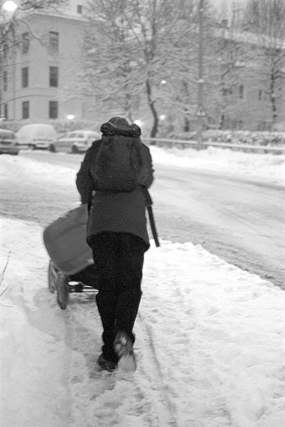 Back in Oslo, walking to work. I wonder how it feels to be struggling up the hill, pushing a stoller through the salty sludge that used to be snow, with a turkey looking for a PAW on your heels?