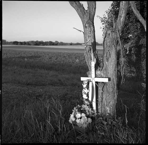 Nesler Road runs perpendicular to Route 20, west of Elgin, Illinois. It begins with a two mile stretch straight as an arrow through the cornfields. There are two small groves of trees, about a quarter of a mile apart. I wonder if Jeremy had floored it if he knew how much pain he would be leaving behind him. Rolleicord V, Agfa APX 100, Rodinal |
