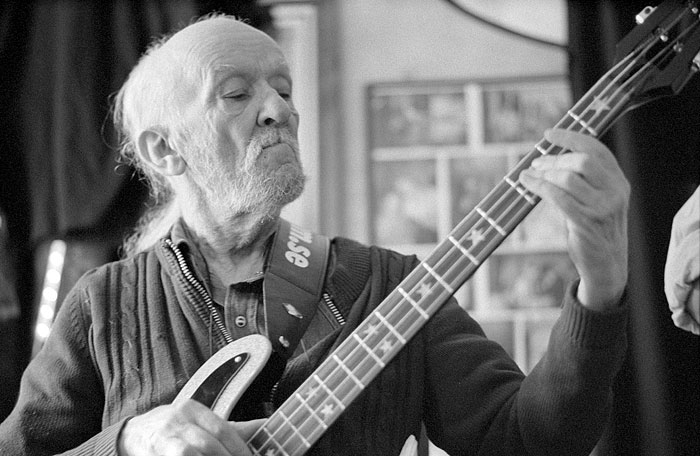 Nisse, jamming at Louice, 2005-03-19 A very nice person. He said his hands shake too much now-a-days and it was a chore stepping over all the cables on the scene, but people helped. Soft-spoken. Leica M2, 90/2.0 Summicron wide-open. Neopan 1600 @ 1600 in Xtol 1:2 |
