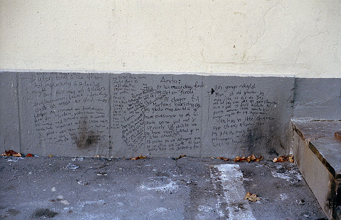 Handwriting on the wall When the junkies have scored on Skippergate, they go to the harbor and find shelter from the wind to cook their devil's brew at a wharehouse outside where I stay while in Oslo. They don't have internet, MSN, ICQ or AIM so if they need to get a message to someone who is not there, they leave it on the walls. Leica M2 35/2.0 Summicron, Fujicolor Xtra 400 |