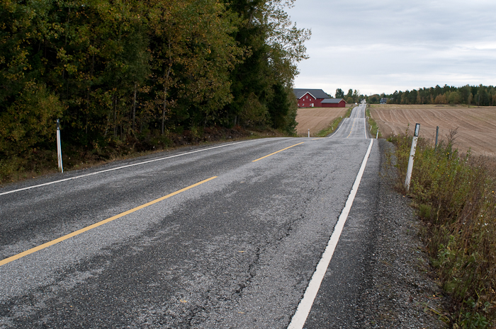 Vägen mellan Halden och Rakkestad, efter att ha klarat 2.5 km uppför när man lämnar Halden. Det fortsätter uppför, men efter 2.5 km finns ca 20 meter där det är plant.